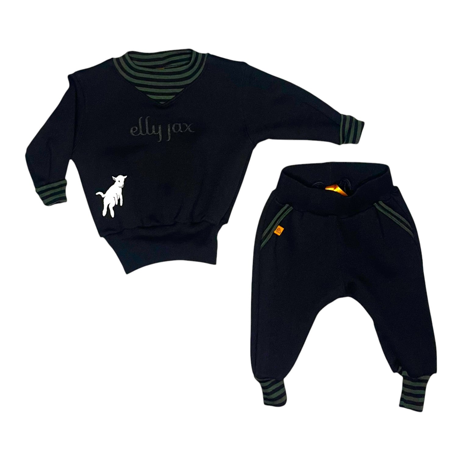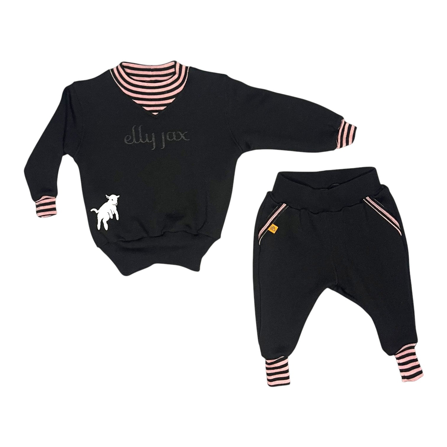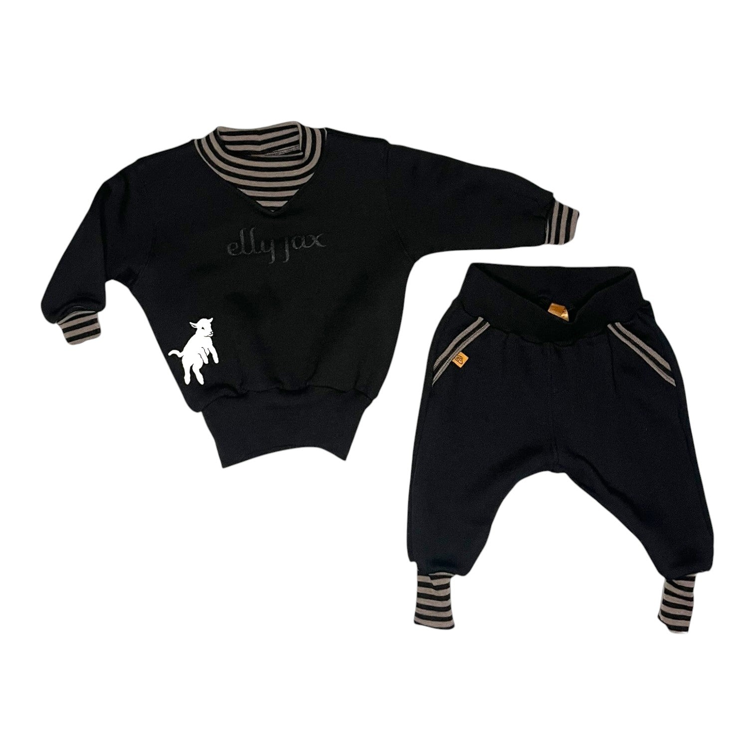 - Trackpant details: Faux pocket with contrast trim, lamb print on the back, and a simple pull-on fit with no ties